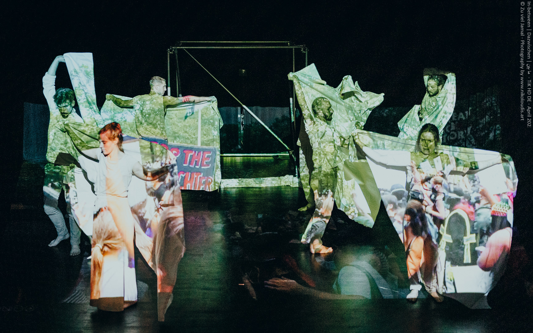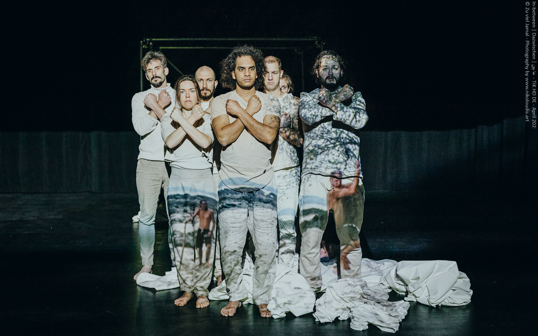 In-between | Dazwischen | ما بين der freien Theatergruppe ZU VIEL JAMAL ist eine kreative Auseinandersetzung mit dem Phänomen der Bedeutung. Es handelt sich um eine kollektive Stückentwicklung zur Fragestellung: Was ist wichtig im Leben? Mögliche Antworten finden ihren Ausdruck in Bewegung, Tanz und Sprache.